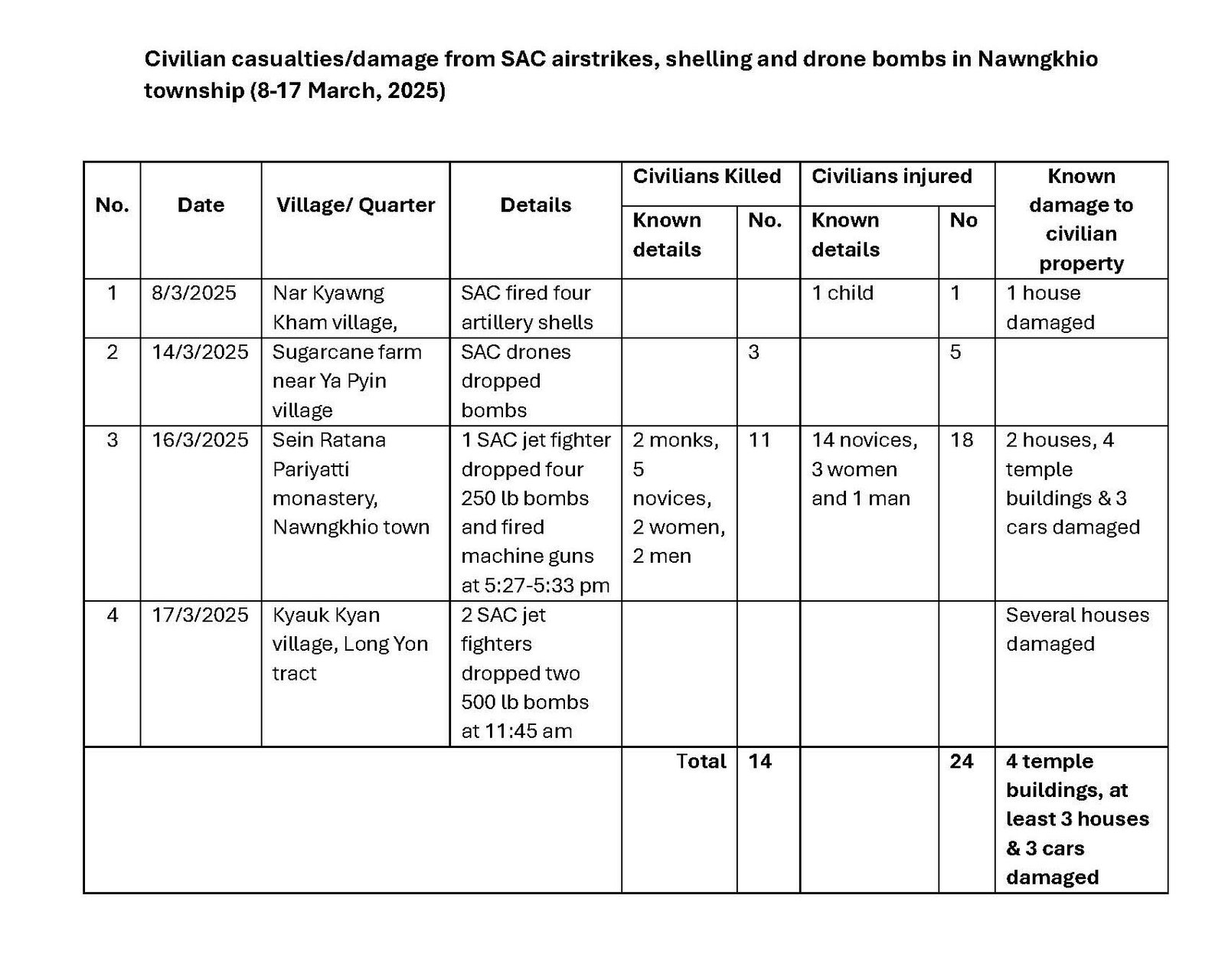 Between March 8 and 17, 2025, SAC airstrikes, artillery and drone attacks killed fourteen civilians and injured twenty-two in areas of Nawngkhio township controlled by the Ta’ang National Liberation Army (TNLA). Most of the casualties were young Buddhist novices targeted in an airstrike on a monastery in Nawngkhio town.