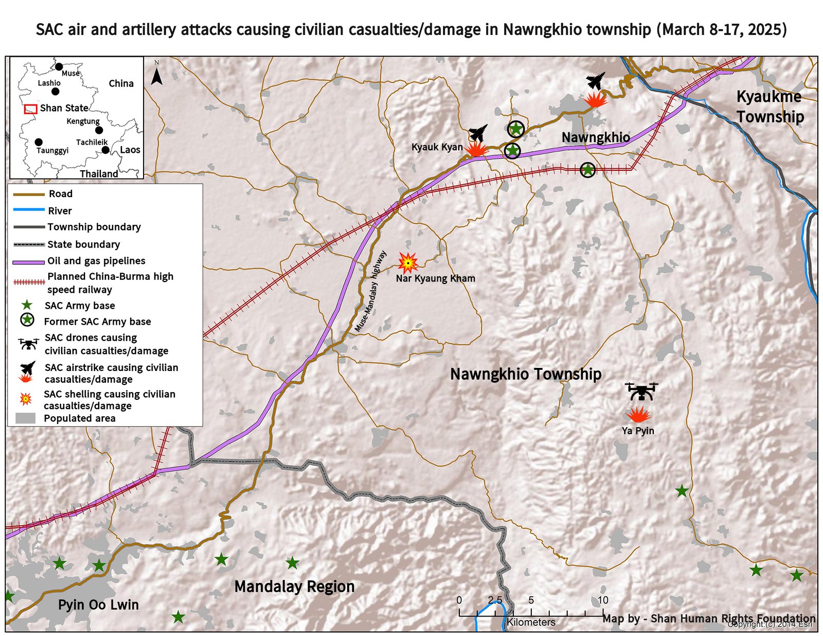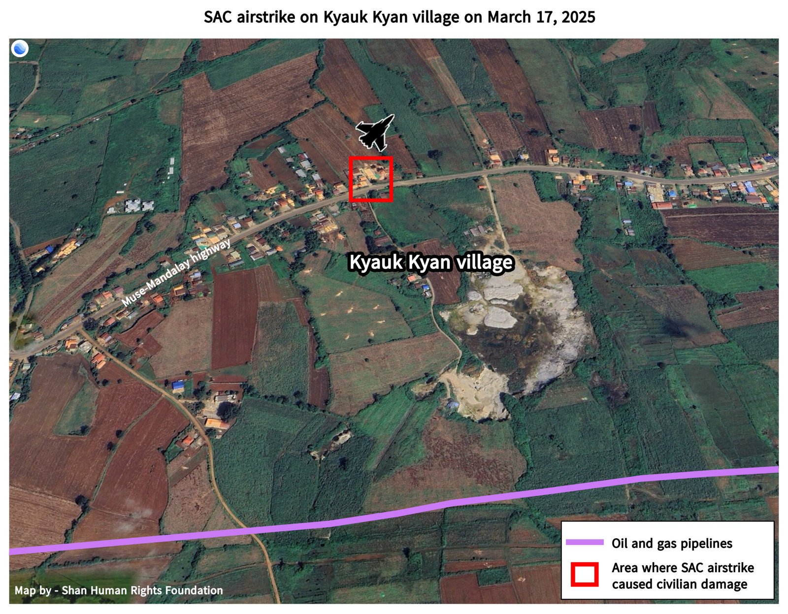 On March 17, at 11:45 am, two SAC fighter jets dropped two bombs and fired machine guns into Kyauk Kyan village, five kilometers west of Nawngkhio town. The bombs fell about 700 meters from the Chinese oil and gas pipelines. Several houses were damaged by the bombing.