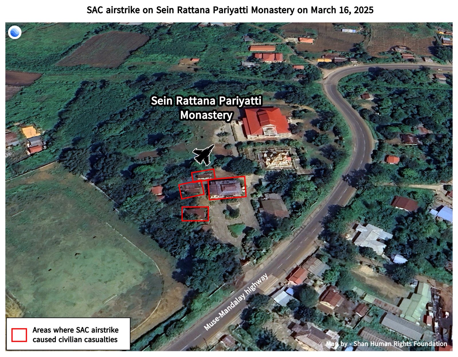 On March 16, at 5:30 pm, a SAC fighter jet dropped four 250-pound bombs and then fired machine guns on the Sein Ratana Pariyatti monastery at the eastern edge of Nawngkhio town. The attack killed eleven civilians (two monks, five novices, two women and two men) and injured eighteen others (fourteen novices, three women and one man). Some died instantly from the bombing, but four novices were killed by machine gunfire while trying to run away. As it was still daylight, and the novices were wearing red robes, their status as civilians must have been clearly visible to the SAC pilots, who deliberately gunned them down. One seriously injured novice died in hospital on March 17.