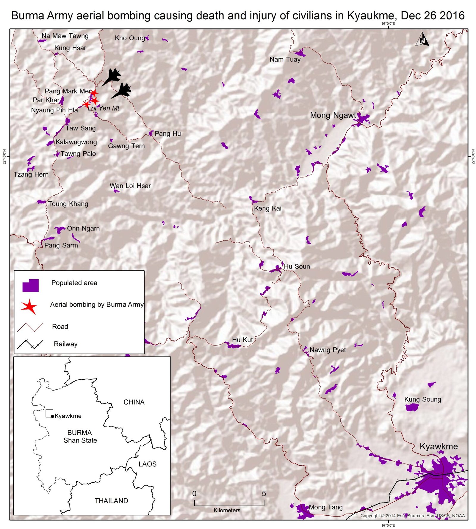 However, at about 4.05 pm, two Burma Army jets flew from Lashio, and began dropping bombs on the Loi Yean mountain area and also directly on the village of Pang Mark Mur.