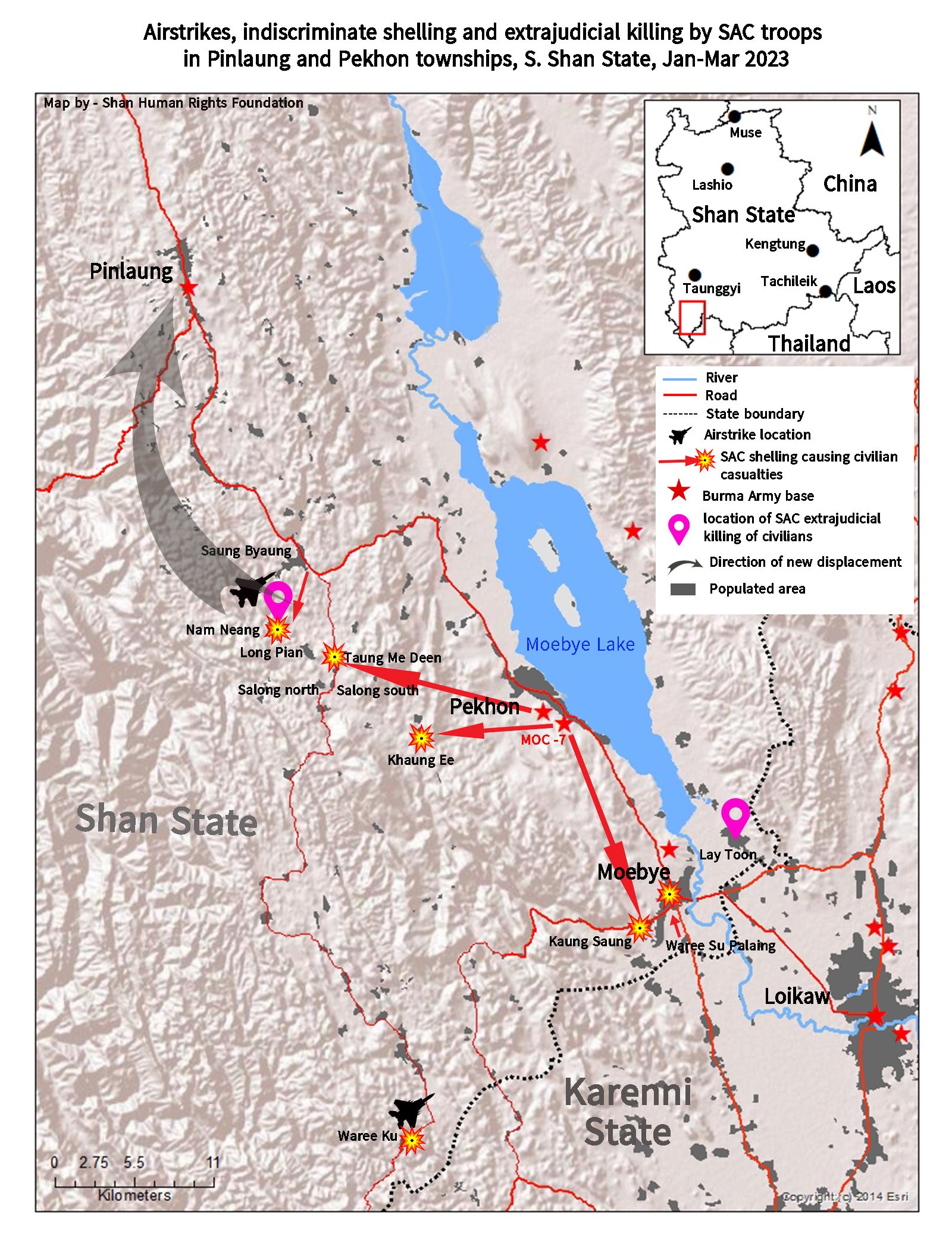 SAC military operations against PDF groups in Pekhon and Pinlaung townships of southern Shan State since early this year have killed at least 33 civilians, including 21 massacred by SAC troops in Nam Neang village on March 11, and eight killed by SAC shelling of populated areas.