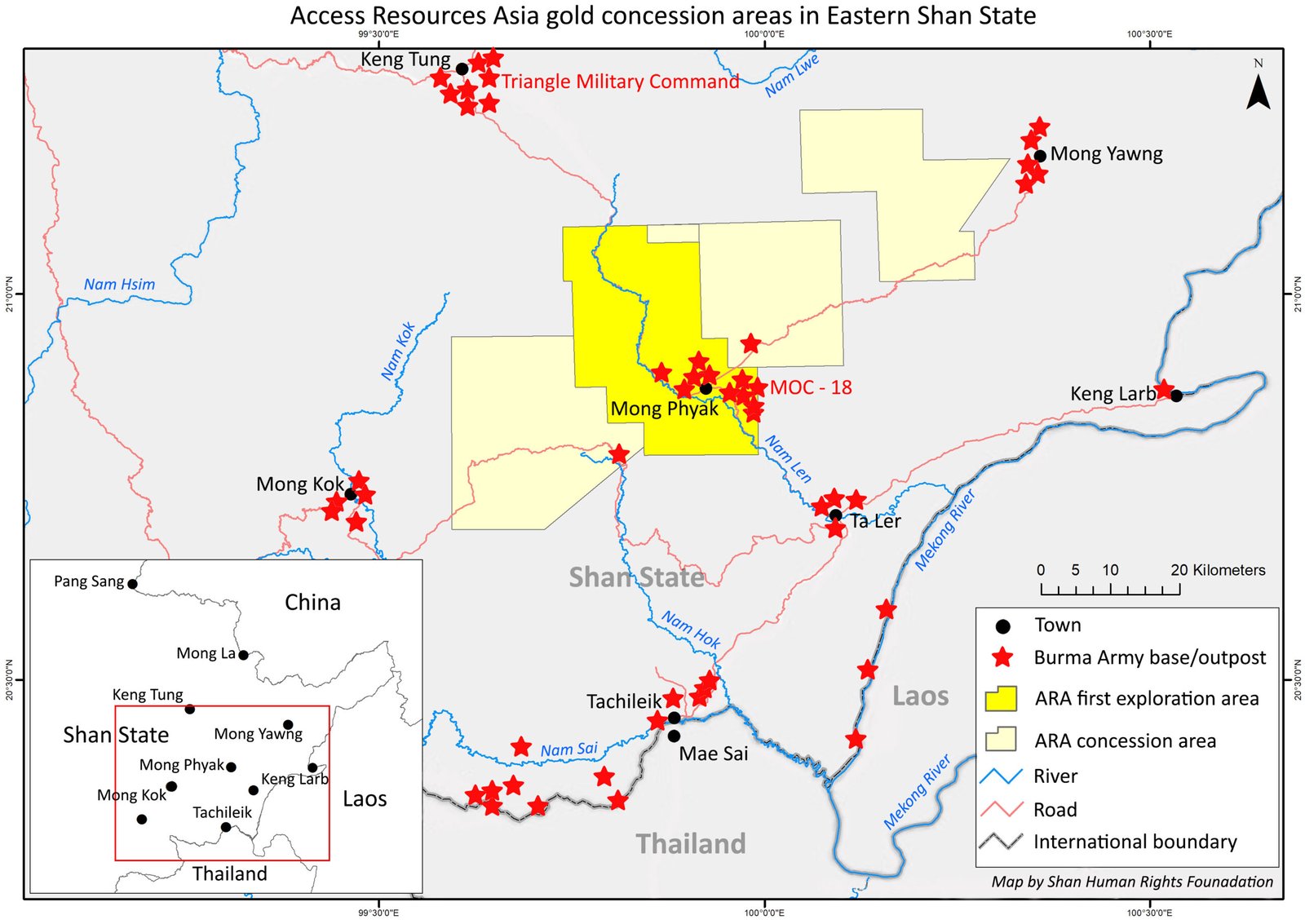 ARA’s initial exploration site covers 574 square kilometers, out of its total 1,800 sq. km. concession area in eastern Shan State. This giant gold mining venture is strongly opposed by local communities, due to the devastating environmental and social impacts of existing gold excavation in eastern Shan State, which has gutted mountains and poisoned farmlands and water sources over a wide area, particularly in Tachileik township.