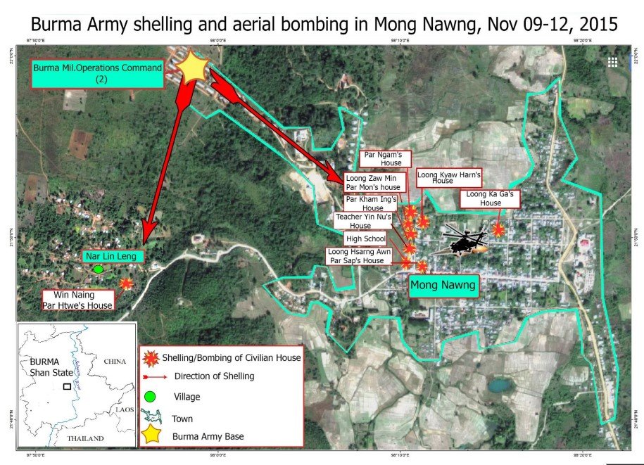 The Shan Human Rights Foundation strongly condemns the Burma Army shelling and aerial bombing of Mong Nawng town in central Shan State between November 9 and 12, 2015. The firing of shells and bombs directly into the centre of this densely populated town of 6,000 people, damaging houses and causing civilian injury, meets the definition of war crimes, and must be denounced and acted upon by the international community.