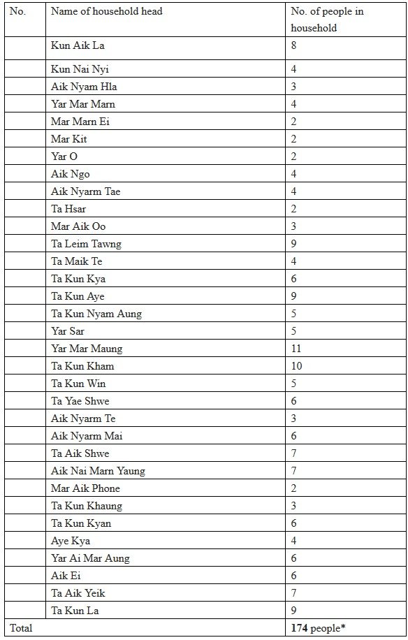 List of families displaced from Pang Karng village, Namtu township since mid-November 2015