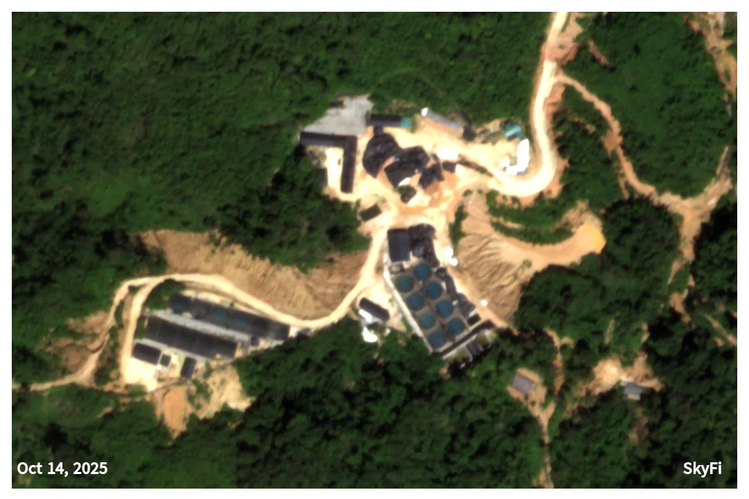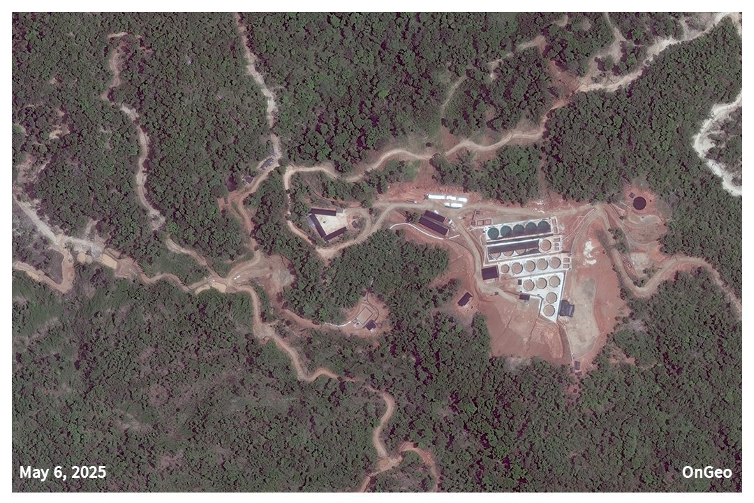 The May 6, 2025 satellite image of the rare earth mine west of the Kok River showed the circular processing pools still under construction. The latest image of this mine shows these pools have been completed and are now covered by black roofing (but still faintly visible beneath).