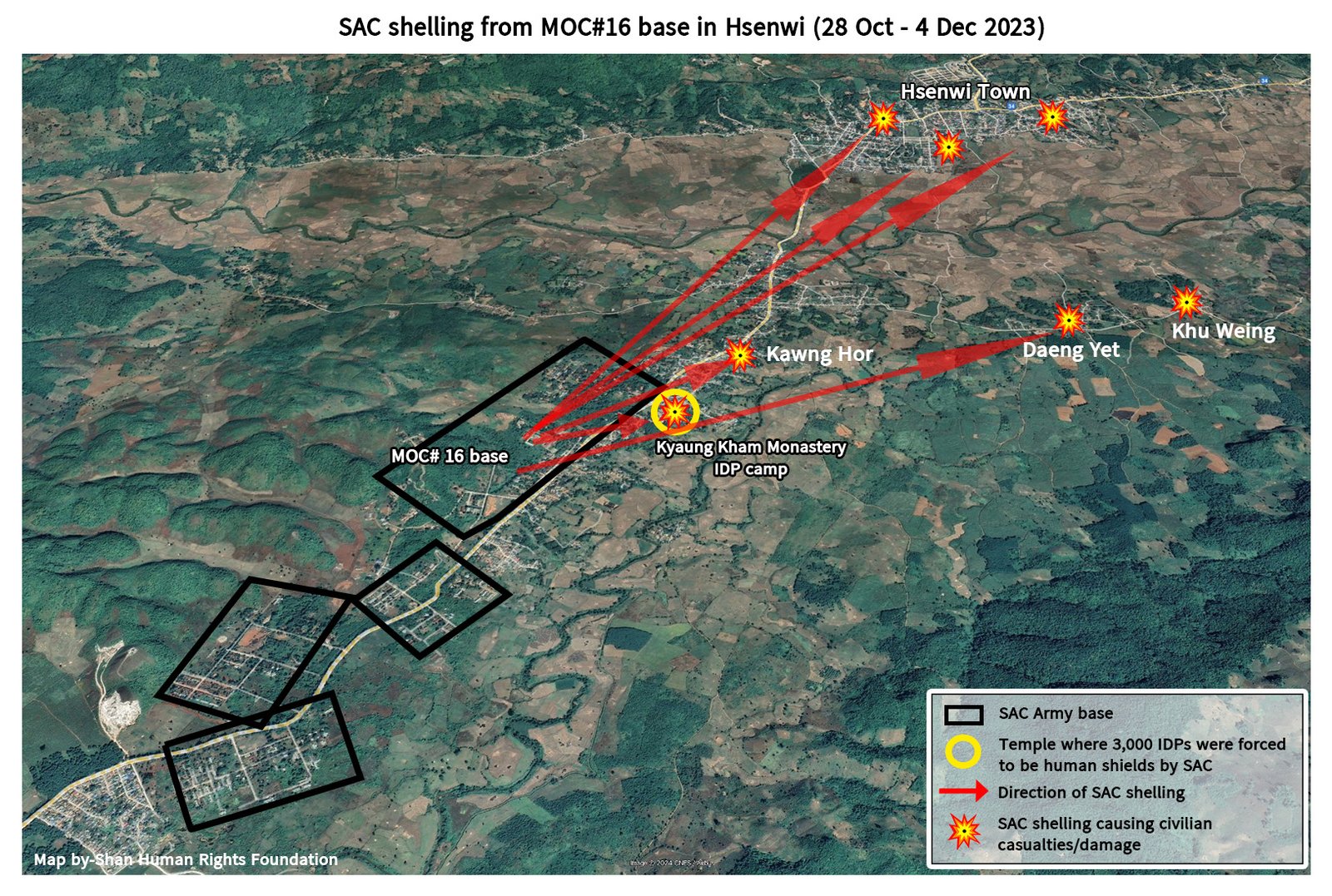 The location of Hsenwi town, at the junction of the two main transport routes to the China border, made it a strategic target for the 3BHA and its PDF allies from the outset of Operation 1027. Heavy fighting in Hsenwi town on October 27 caused many residents to take shelter in local temples, and SAC troops at the Military Operations Command (MOC) #16 base south of the Namtu river began shelling into the town and nearby villages, including Kawng Hor village where IDPs were taking shelter at Kyaung Kham temple. On October 28 alone, SAC shelling damaged over 50 houses, killing one civilian and injuring two.