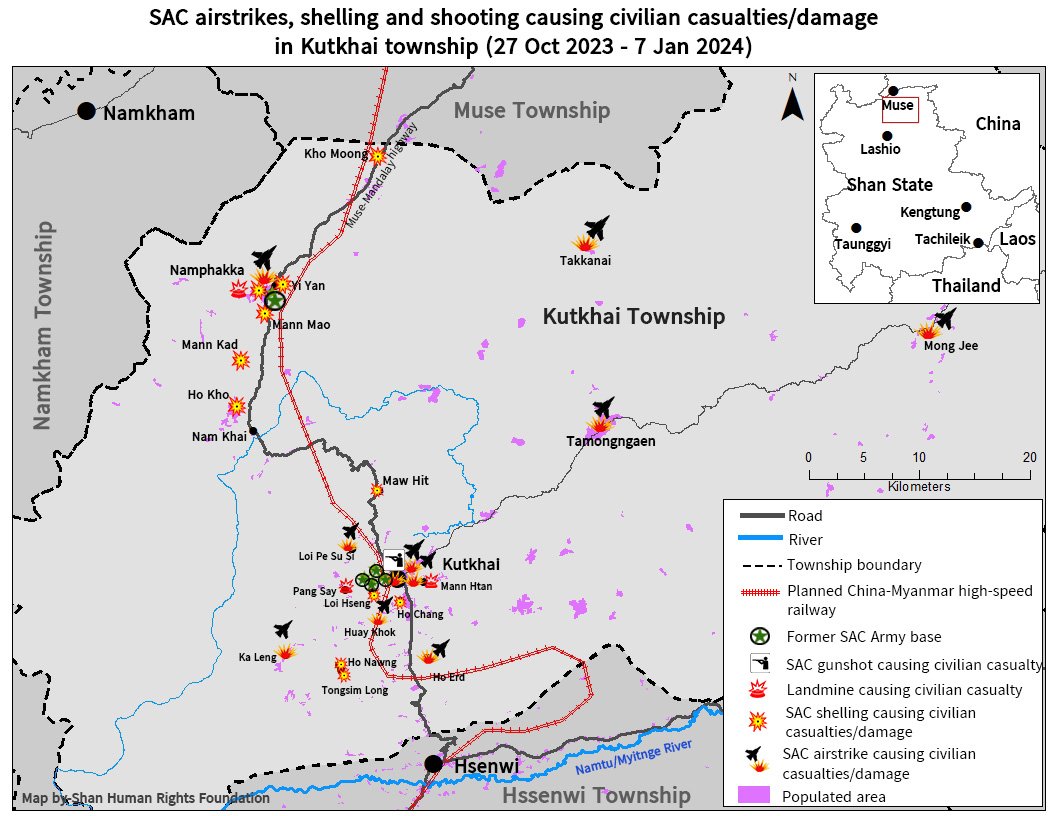 On December 20, heavy fighting broke out between the SAC troops and Ta’ang National Liberation Army (TNLA) in Kutkhai town. Between December 20 and January 3, 2024, due to SAC shelling and airstrikes in Kutkhai town and nearby villages, six civilians were killed and ten injured. On January 7, the TNLA took control of Kutkhai town; on the same day a SAC airstrike on the town damaged 15 houses.