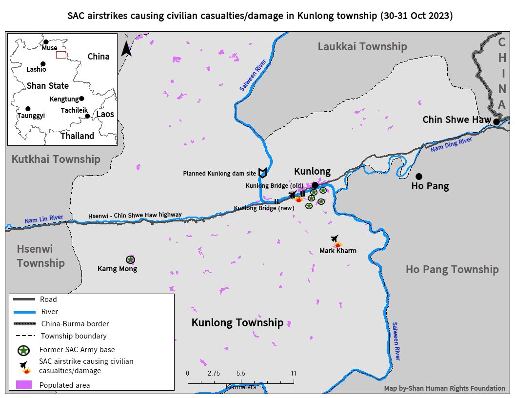 During this time, the SAC launched airstrikes around Kunlong town. On October 30, a SAC bomb landed on Wan Kho village beside the old Kunlong bridge over the Salween River, killing one civilian and damaging his house. The old Kunlong bridge was also damaged by bombing. On October 31, a SAC bomb killed another civilian at Mark Kham village, south of Kunlong town.