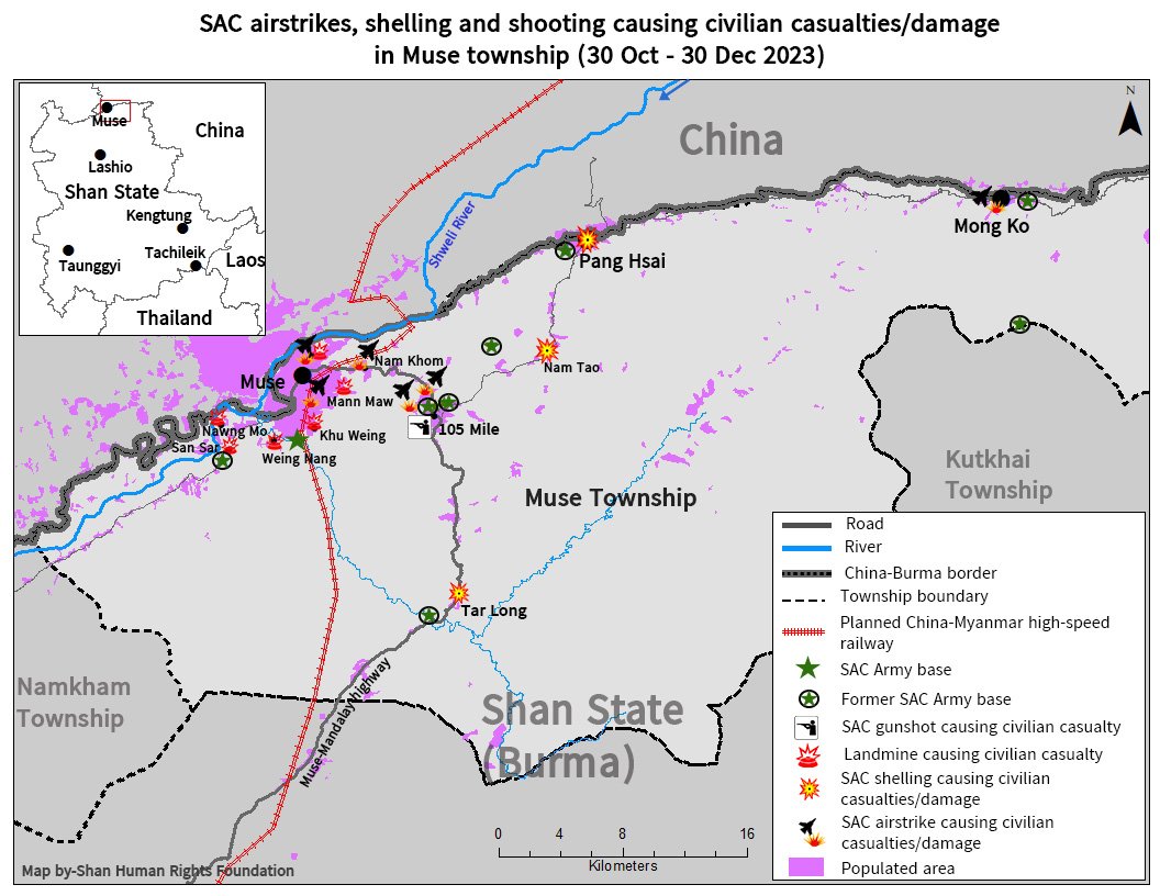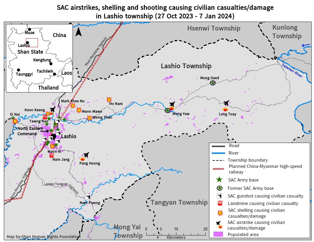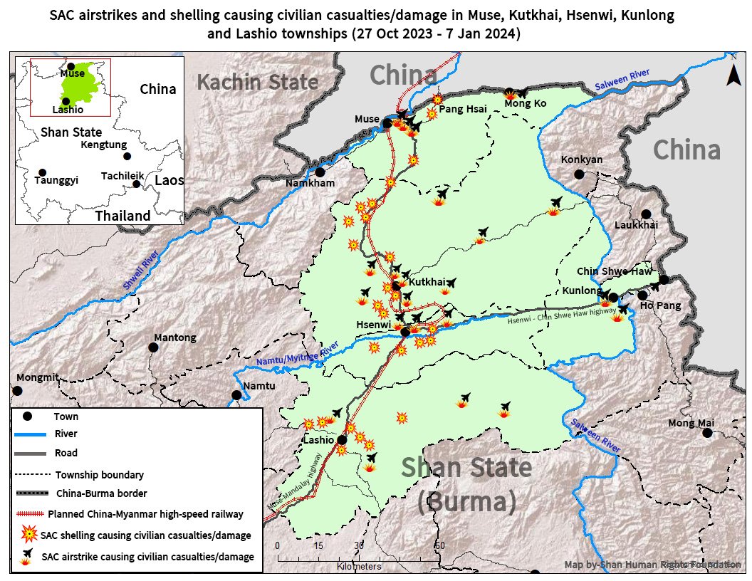 Mapping of SAC airstrikes and shelling attacks in Muse, Kutkhai, Hsenwi, Kunlong and Lashio townships from the start of Operation 1027 on October 27, 2023, until the ceasefire between the SAC and the Three Brotherhood Alliance (3BHA) on January 11, 2024, shows that these attacks are concentrated along the Muse-Hsenwi-Lashio highway and the Hsenwi-Chin Shwe Haw highway – the two main trade routes from northern Shan State into China.