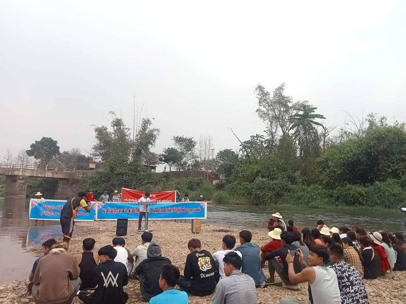 Today about 60 local villagers from four tracts — Na Nio, Nam Ma, Mawk Tawng and Mong Jit –gathered on the banks of the Nam Ma river holding banners in Shan and Burmese reading: “This river is not for sale for personal profit”, “Let all Shan State rivers flow freely forever”.