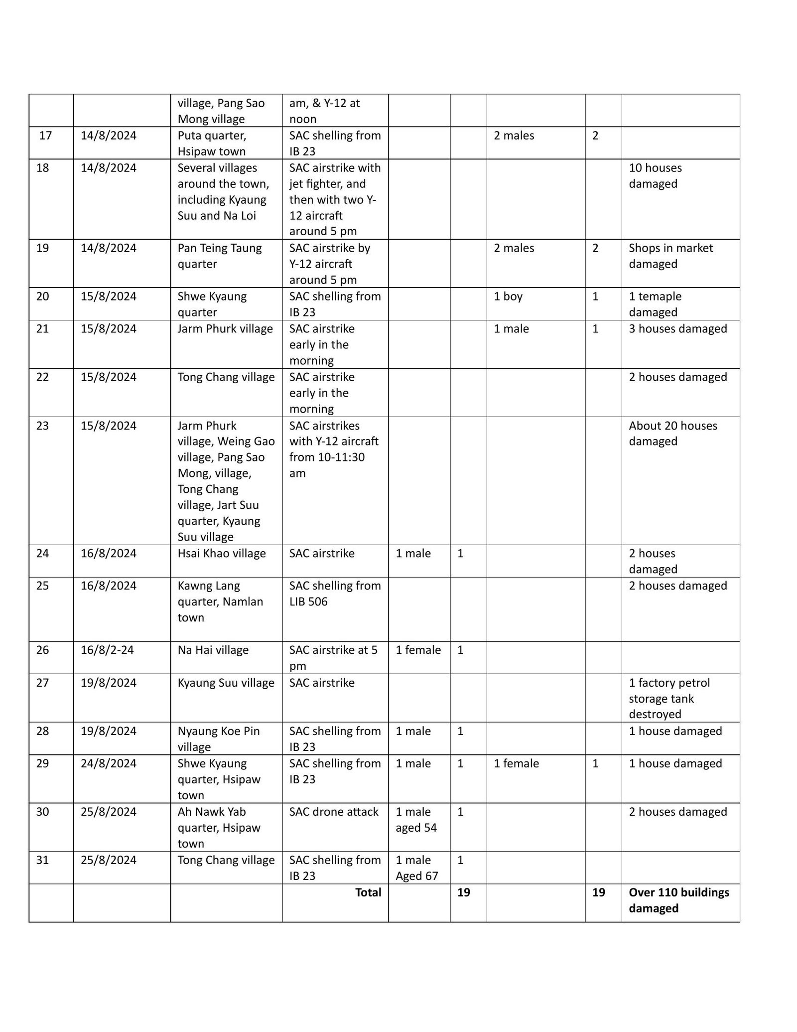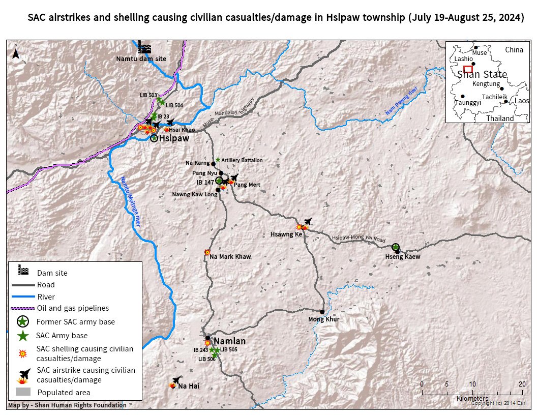 Heavy SAC airstrikes and shelling against resistance forces advancing into Hsipaw township killed 19 civilians, injured 19 and damaged over 110 buildings, including near China’s oil and gas pipelines, between 19 July and 25 August 2024.