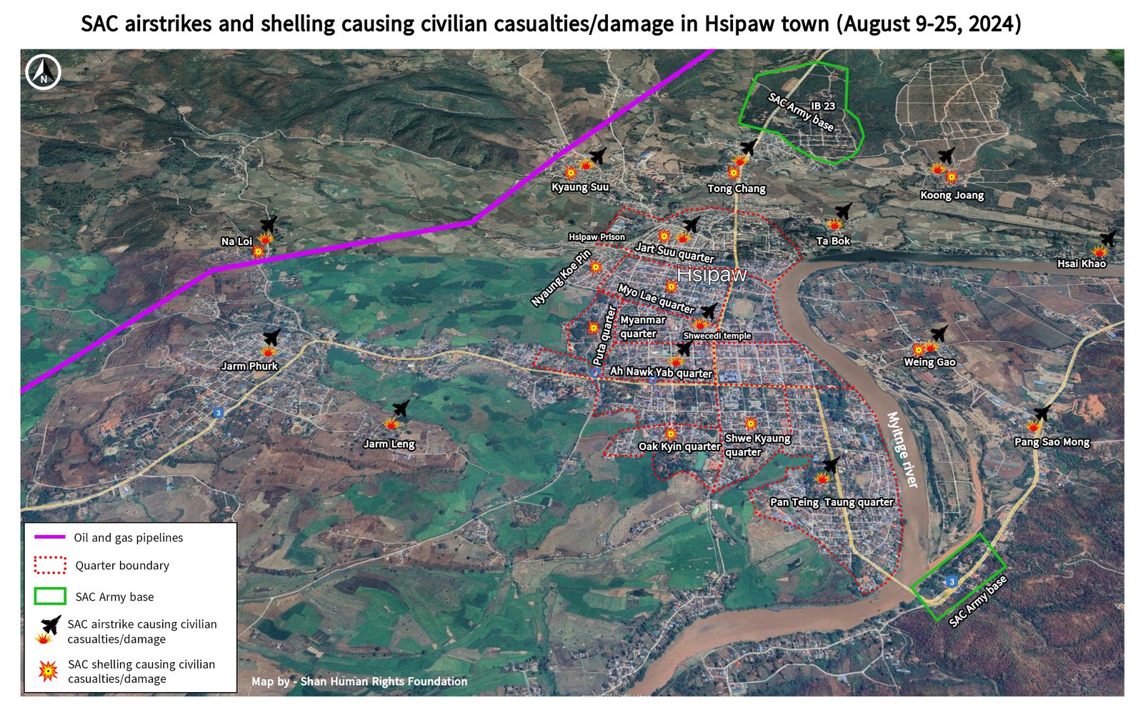 Heavy SAC bombardment of Hsipaw kills 19 civilians, injures 19, damages over 110 buildings, including near Chinese pipelines