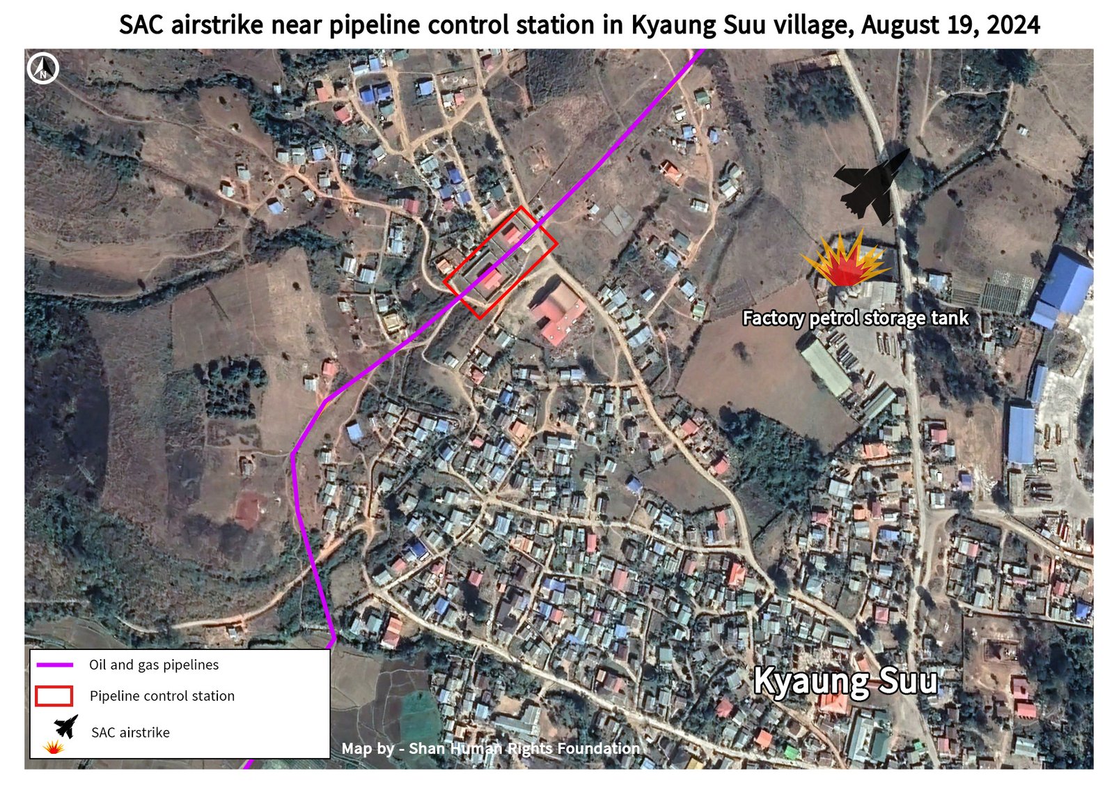 From August 12 to 19, SAC continued relentless air and artillery attacks in Hsipaw town and surrounding villages, inflicting further civilian casualties and damaging scores of buildings. Airstrikes on August 14, 15 and 19 damaged buildings in Na Loi and Kyaung Suu villages next to the Chinese pipelines – including a factory petrol storage tank at Kyaung Suu which caught fire only 250 meters from the pipeline control station.
