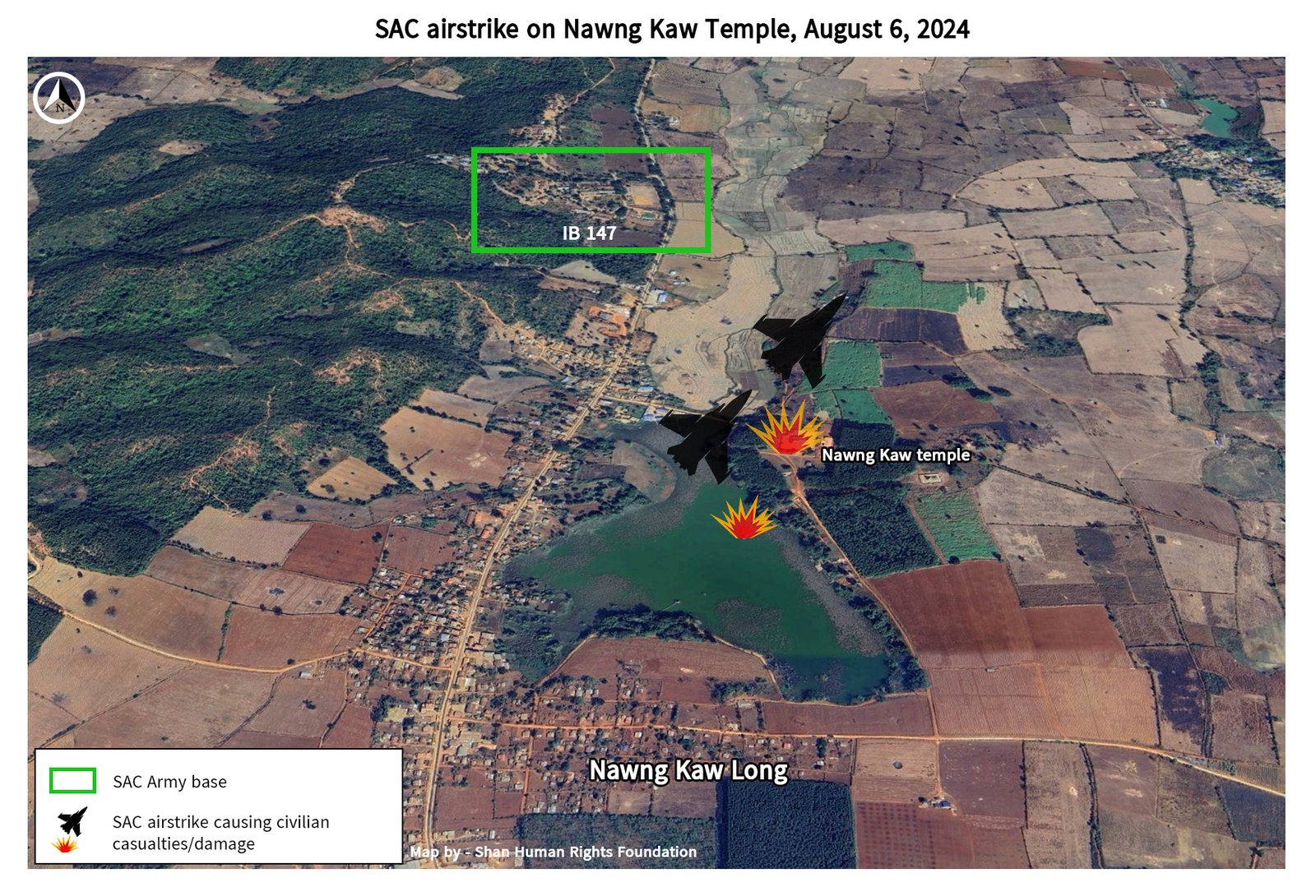 In late July, MNDAA troops started attacking the IB 147 SAC base near Nawng Kaw Long village, 20 kms southeast of Hsipaw town on the Hsipaw-Namlan road. On August 6, a SAC jet fighter dropped bombs on Nawng Kaw temple, killing a monk and a layperson, and injuring another monk. That day, SAC troops also carried out an airstrike on Pang Mert village, 2 kms northeast of Nawng Kaw Long village, injuring a villager.