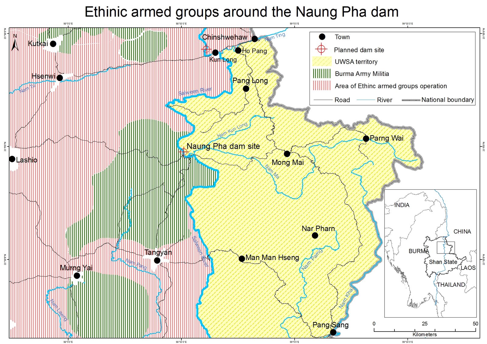 The Naung Pha dam is situated in an active conflict area. West of the dam site and projected reservoir area, the Burma Army and its militias are carrying out offensives against ethnic armed groups including the Shan State Progress Party/Shan State Army (SSPP/SSA), Kachin Independence Army (KIA), and the Ta’ang National Liberation Army (TNLA) to seize control of their areas and local natural resources. None of these groups signed the Nationwide Ceasefire Agreement (NCA) on October 15, 2015.