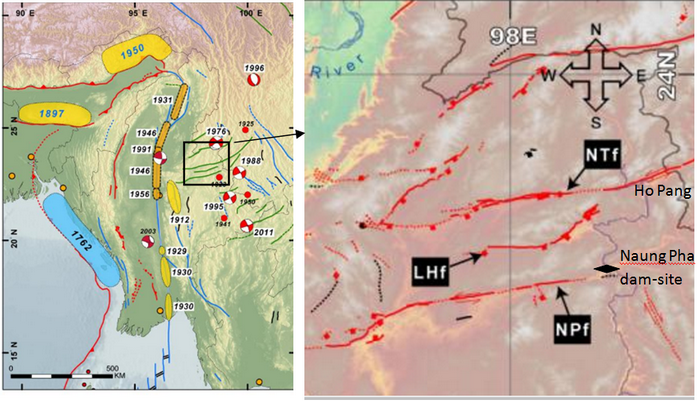 Map of large earthquakes in Burma Fault lines near Naung Pha dam site (NTf = NamTing fault, NPf = Nampawng fault)