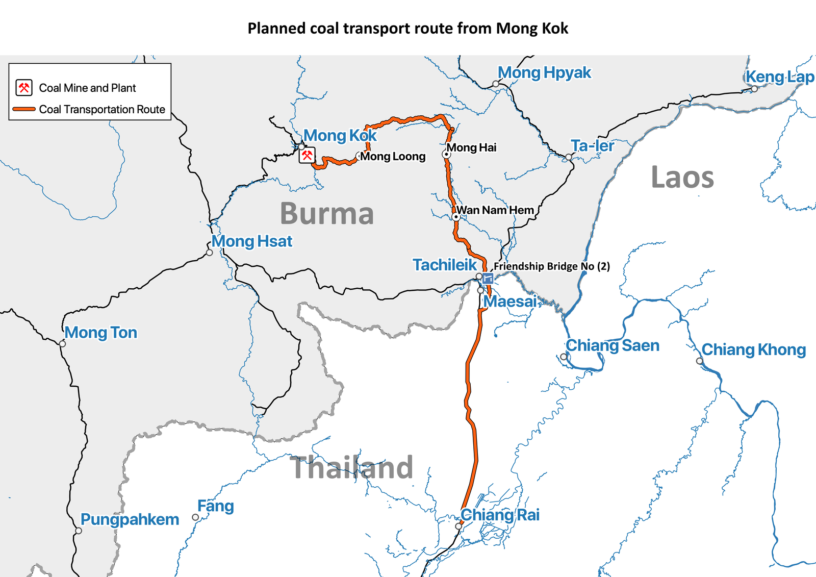 Thai company staff say that the coal will be transported by road from Mong Kok through Mong Loong and Mong Hai to Taw Kaw in Tachileik, from where it will be transported across the No. 2 Friendship Bridge to Maesai in Thailand.