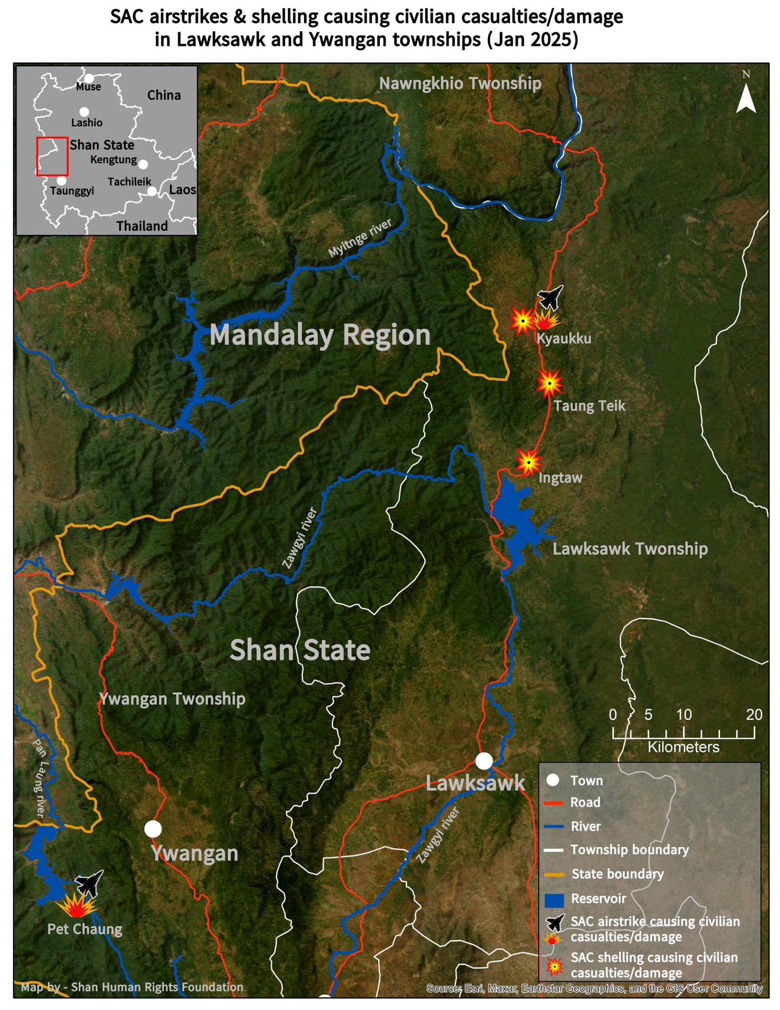 7. SAC airstrikes and shelling in Lawksawk and Ywangan townships