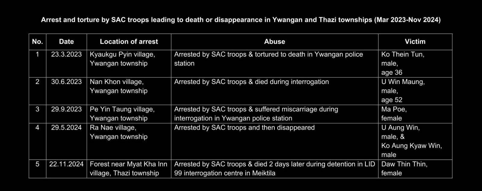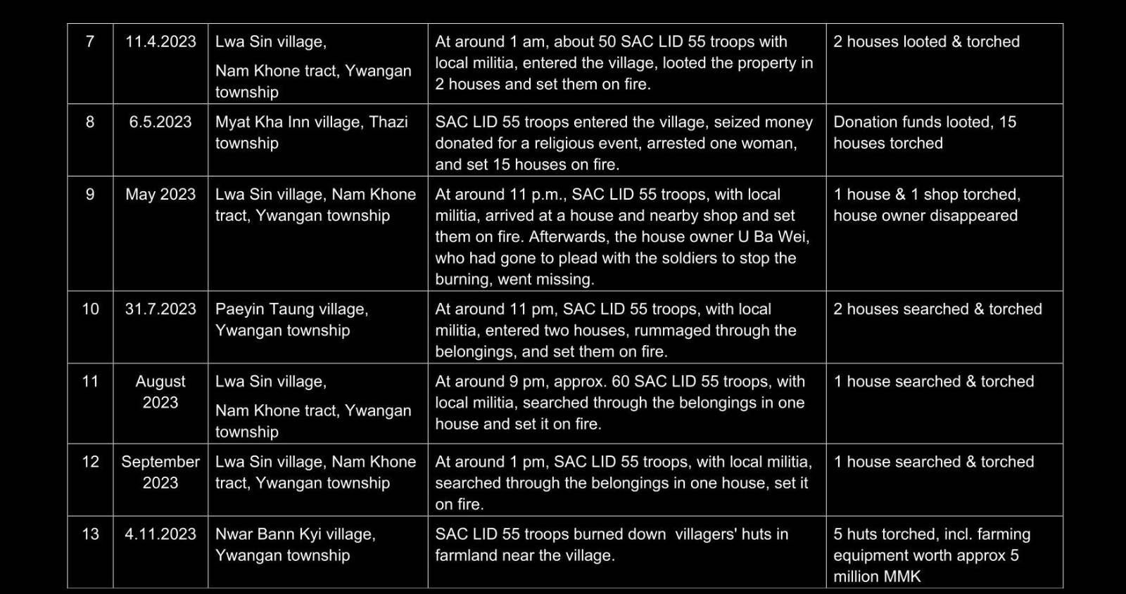The report also highlights the ongoing use of sexual violence by SAC troops, including gang-rape of three women by six LID 55 soldiers in May 2023, and sexual torture of a 23-year-old woman detained in Ywangan, who was later sentenced to 12 years in prison on anti-terrorism charges.