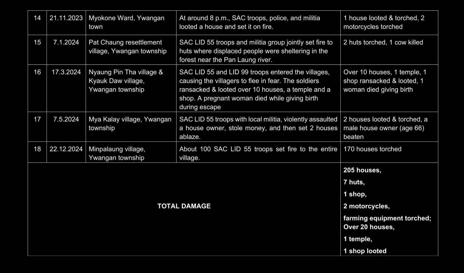 SAC forces have burned down at least 205 houses and 7 huts in ten villages/wards across Ywangan township and adjoining areas of Tharzi township between May 2022 and December 2024.