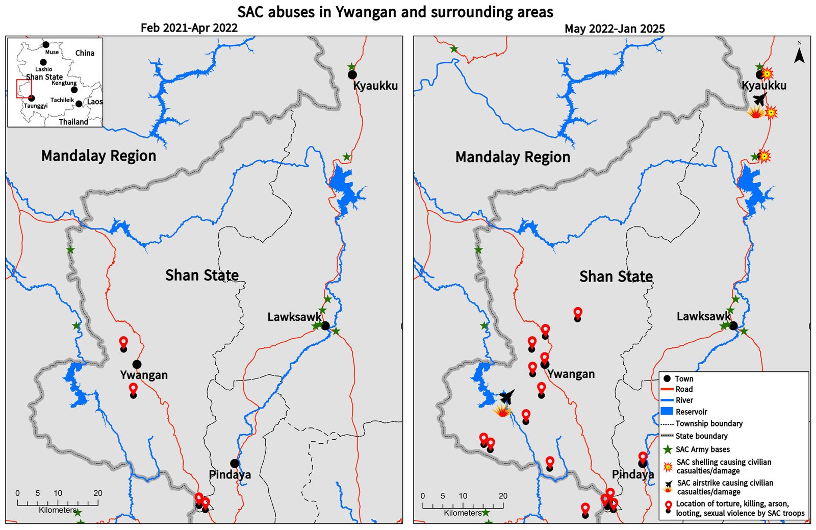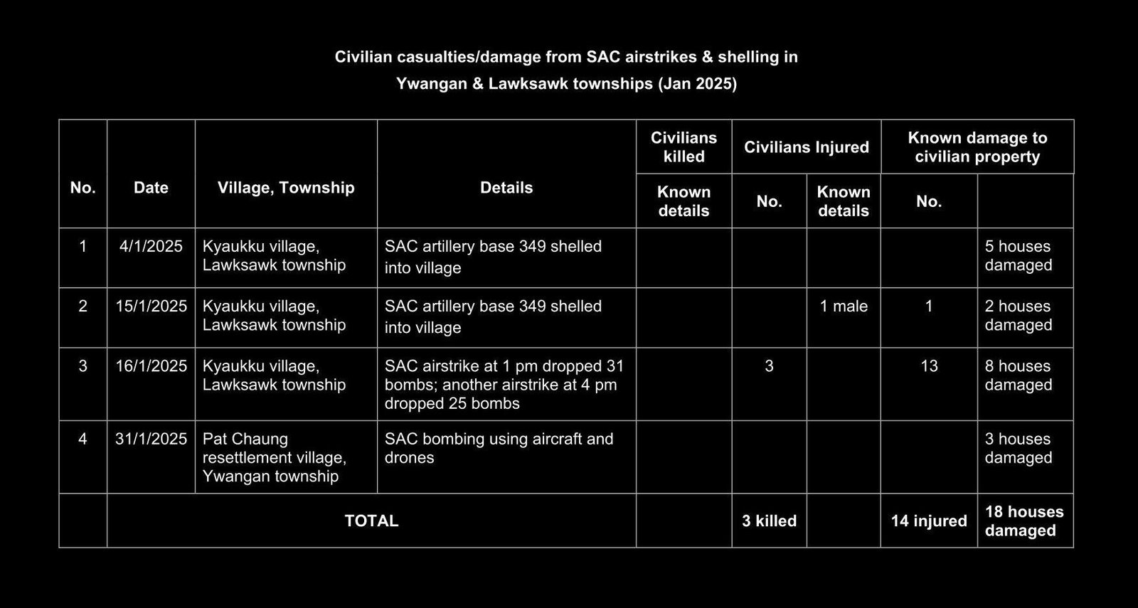 Since December 2024, the SAC has also started using airstrikes and heavy artillery against Danu resistance forces. SAC air and artillery strikes in Kyaukku, northern Lawksawk township, between December 18 and January 16, killed three villagers and injured 14, while an airstrike in Ywangan on January 31 damaged several houses.