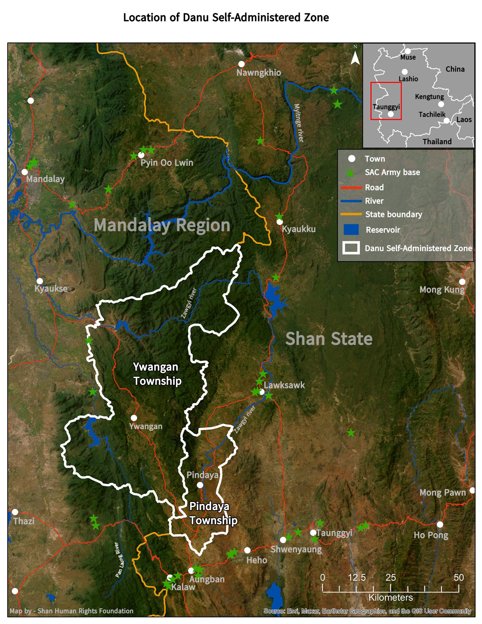 Ywangan is one of two townships — the other being Pindaya — which form the Danu Self- Administered Zone. Ywangan township lies on the western edge of the Shan plateau, on the border of Southern Shan State and Mandalay Region. It is easily accessible to the cities of Mandalay and Kyaukse through the Ywangan-Han Myint Mo road and to Taunggyi — where the regime’s Eastern Military Command is based — via the Ywangan-Aung Ban-Heho Road. It also connects to Northern Shan State through the Ywangan-Pindaya-Lawksawk road.