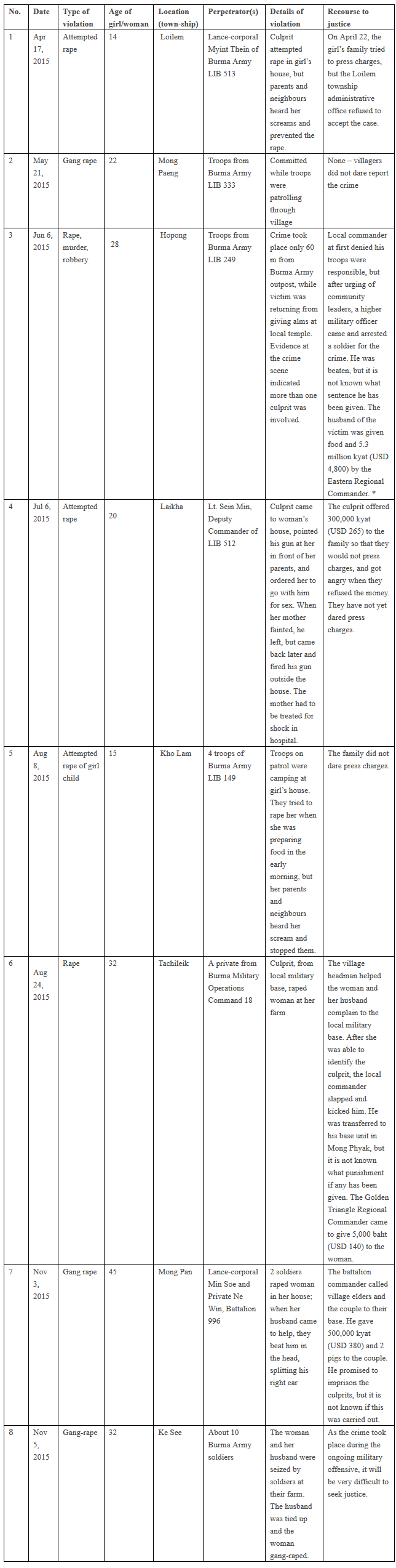Summary of documented incidents of sexual violence by Burmese government troops in Southern and Eastern Shan State (April- November 2015)