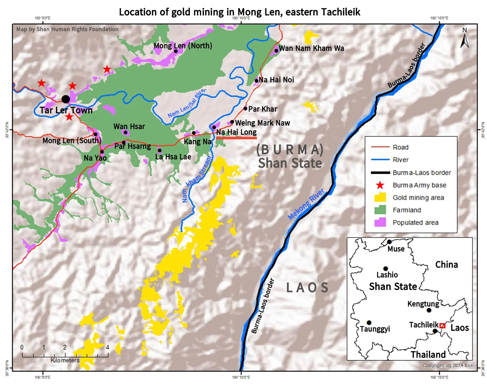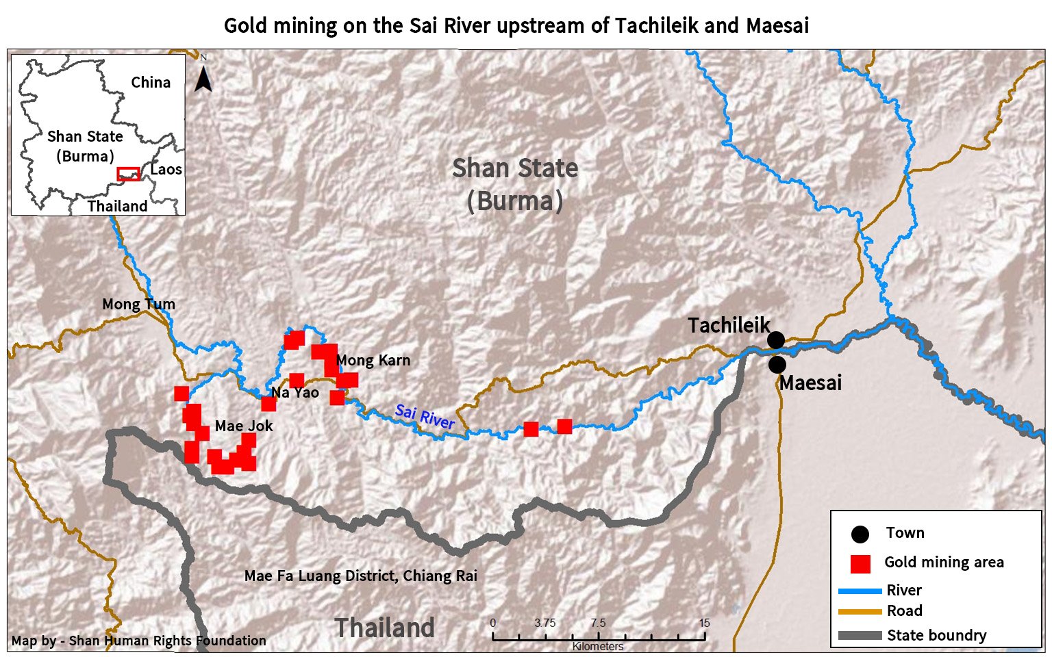 The Sai River is one of several Mekong tributaries and sub-tributaries in eastern Shan State which have been impacted by expanded mining in recent years. These include the Kok River, impacted by coal and gold mining; the Ruak River impacted by manganese mining; and the Len River, impacted by gold mining.