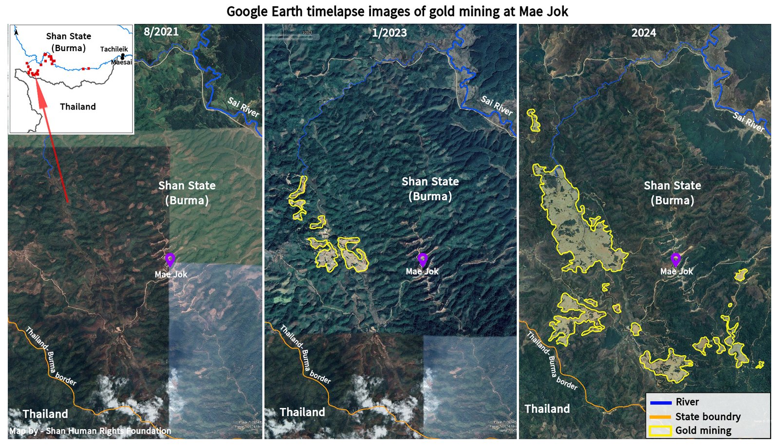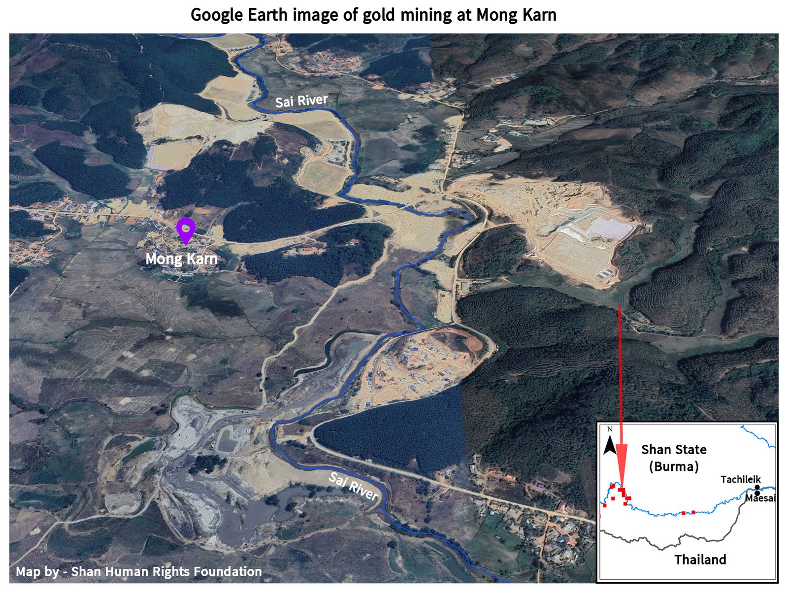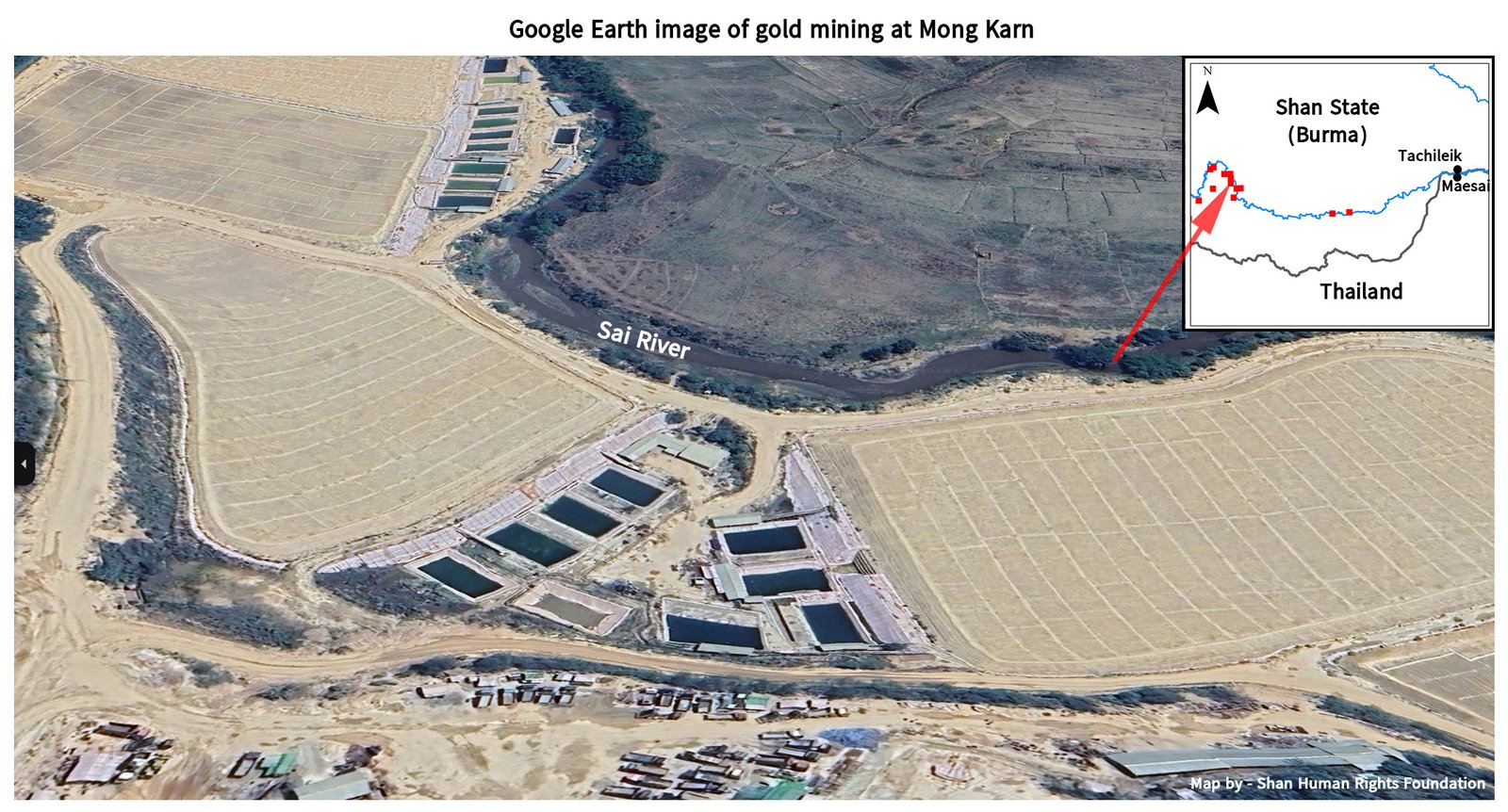 A satellite map in the study highlighted clearly that gold mining areas in eastern Mong Hsat along the Sai River upstream of Mae Sai were the source of the muddy sediment afflicting the town.