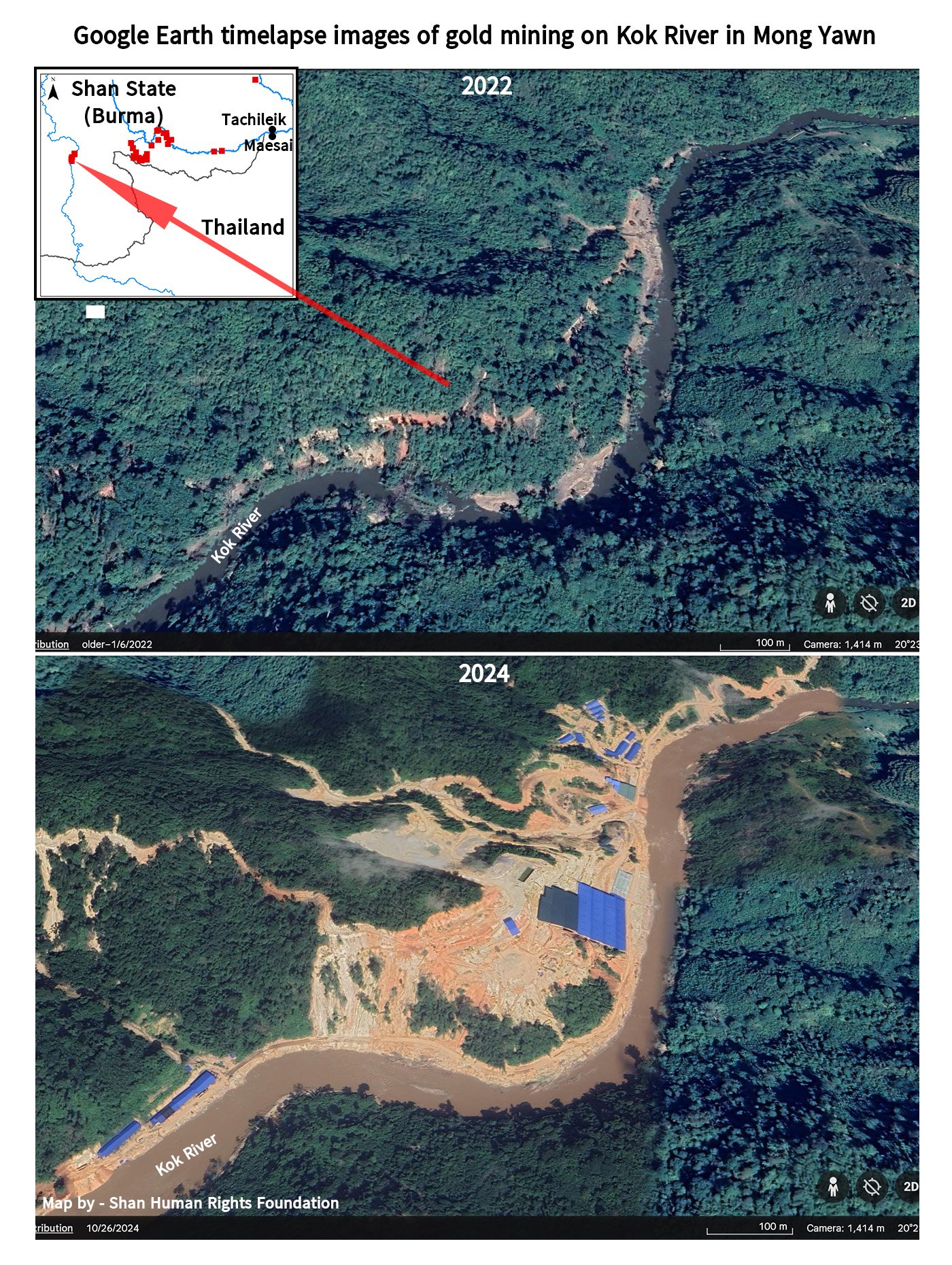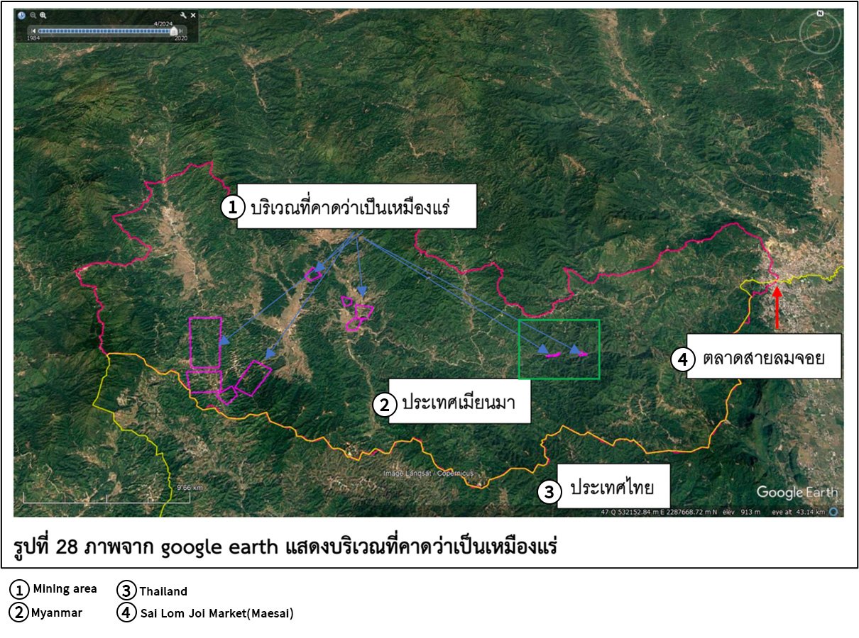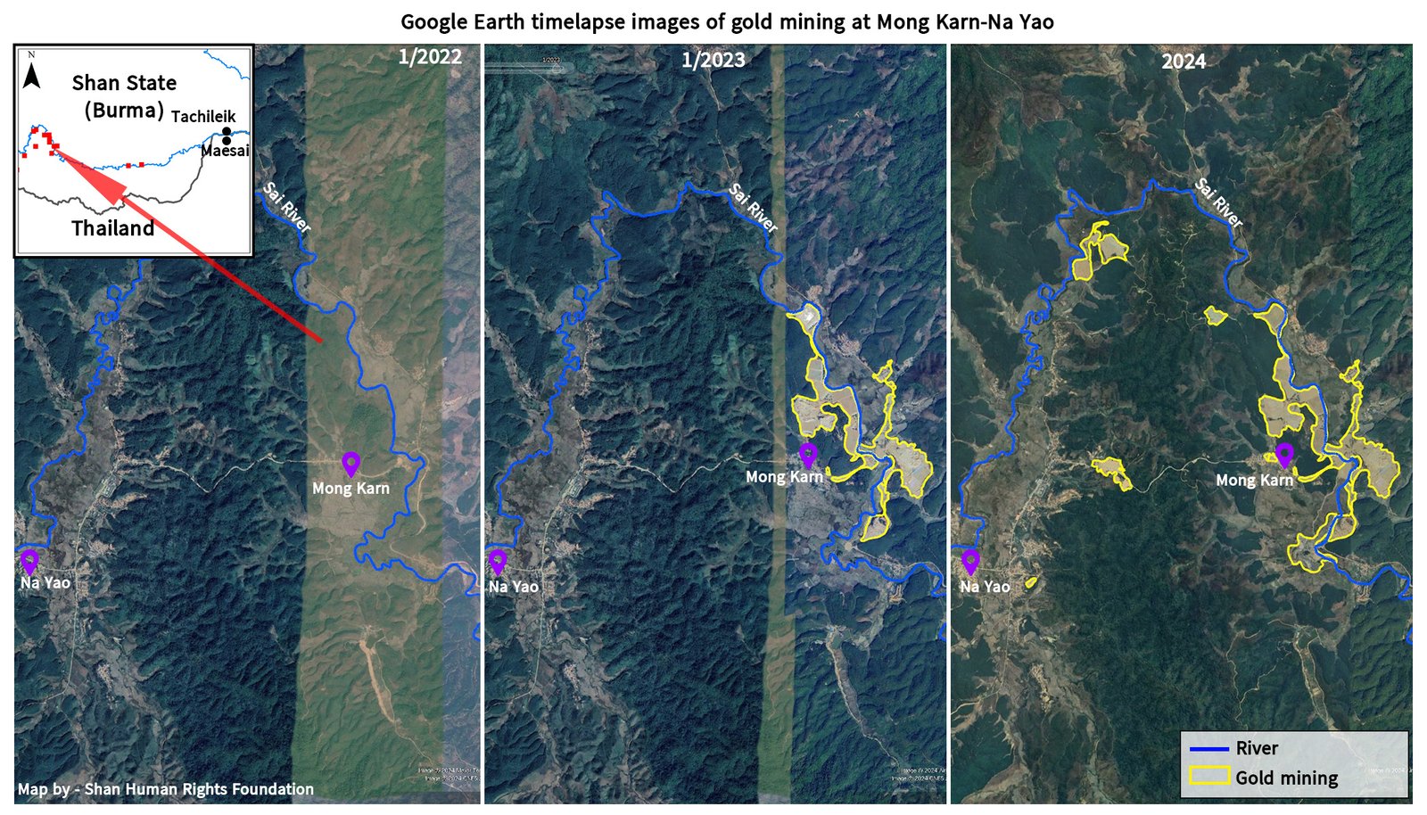 A satellite map in the study highlighted clearly that gold mining areas in eastern Mong Hsat along the Sai River upstream of Mae Sai were the source of the muddy sediment afflicting the town.