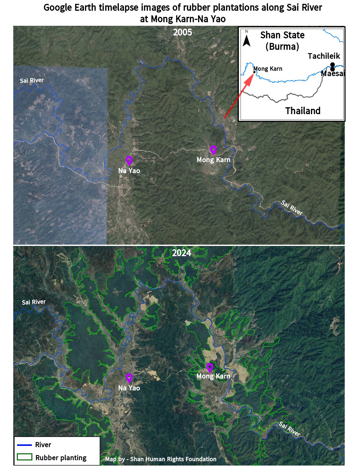 The UWSA first set up a base in the Mong Karn-Na Yao area in 1999, and during the next two years forcibly relocated over 16,000 Wa villagers from northeast Shan State into the area (who were among the 126,000 Wa forcibly resettled to Mong Ton, Mong Hsat and Tachileik townships between 1999 and 2001), displacing over 1,200 local villagers, mostly Shan subsistence rice farmers. Since that time, the ecology of the area has been vastly altered by the UWSA’s export-oriented agricultural policies, involving large-scale planting of rubber on the hills along the Sai river.