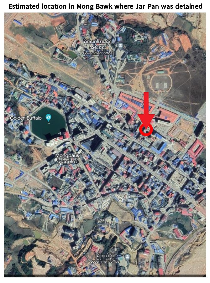 Following a brief stay in Panghsang, Jar Pan arrived in Mong Pawk on September 30, 2022. She underwent a 14-day quarantine period in an apartment near a temple in the town. On October 15, the broker Ah Shan arrived to collect only Jar Pan. He took her to an unmarked building near Mong Pawk market, where she was introduced to a male manager and female assistant manager who she would be working under. Both were Chinese nationals.