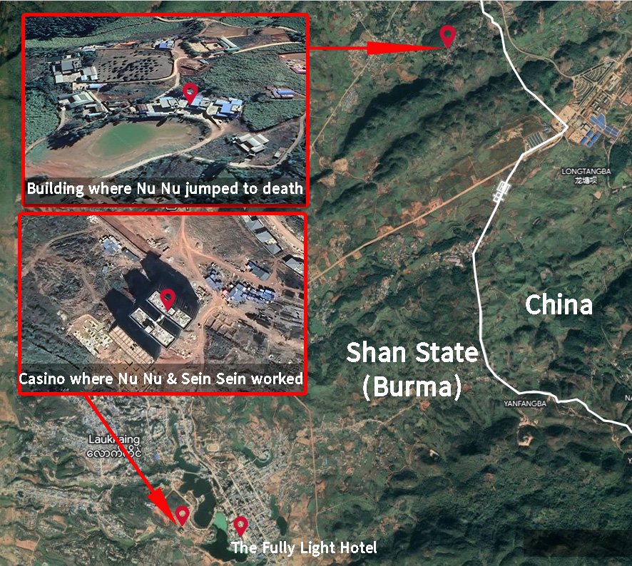 A young woman called Nu Nu, who was hired as an accountant at the Ta Ying casino in Laukkai, was unjustly accused of embezzling 60,000 yuan. She was detained, together with her elder sister Sein Sein, who also worked at the casino, at a company building outside Laukkai where on-line scamming took place. Nu Nu was ordered to repay the money within one week. Five days after being detained, Nu Nu was summoned by her boss to a room in the Fully Light Hotel in Laukkai, where she was raped by the boss and three other Chinese men. Severely traumatized, Nu Nu committed suicide three days later by jumping from their room on the fourth floor.