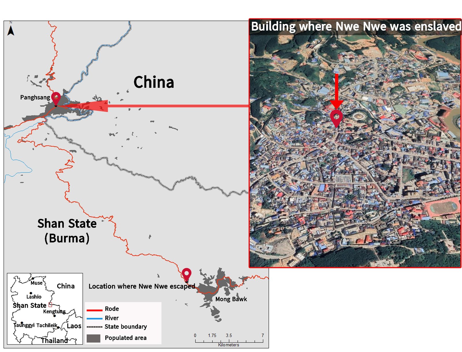 Maps show that the criminal enterprises to which victims were trafficked in the UWSA-controlled area were located in the town centres of Panghsang and Mong Bawk. The scamming tech support business where women were kept as sex-slaves was housed right in downtown Panghsang, close to the market, while the other criminal businesses in Mong Pawk were in large-multi-storeyed buildings in the central town district.