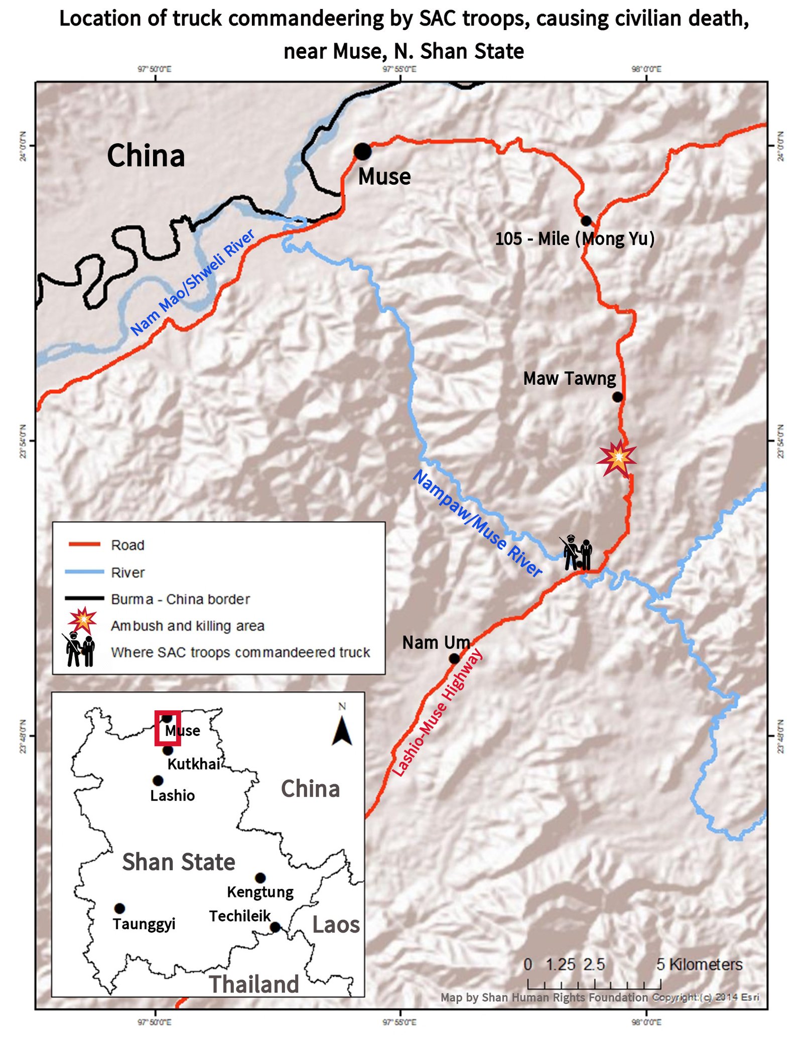 At about 5.20 pm, as they were approaching Maw Tawng village, Mong Yu tract, their truck was suddenly shelled by TNLA troops positioned on a hill top.