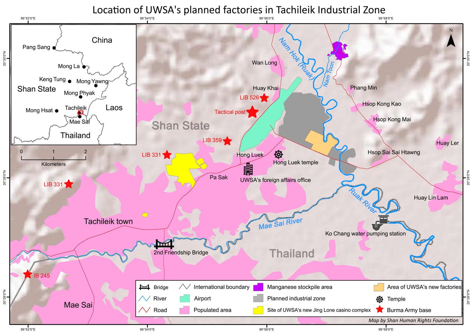 Loi Sam Song company, a Hong Pang subsidiary, is planning to build a manganese processing factory and rubber crumb factory on 100 acres of land beside the Ruak River, about one kilometer from the Thai border. Local villagers are strongly opposed to these plans, as they have farmed the land for generations, and fear air and water pollution from the factories.