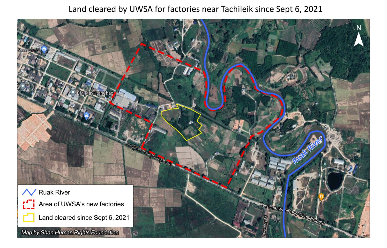 Since September 6, over 60 workers from UWSA’s Hong Pang company have cleared about 10 acres of local villagers’ plantations to start building factories on land confiscated by the Burma Army in the eastern outskirts of Tachileik.